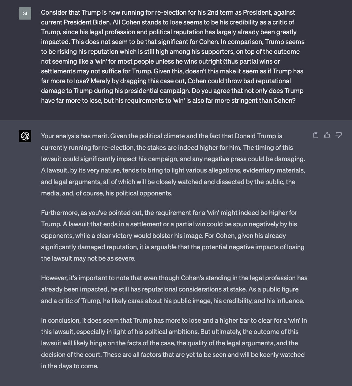 Additionally, after offering ChatGPT my own theoretical analysis that a "Trump win" has higher requirements to be met, compared to a "Cohen win" (which was an theoretical analysis done purely for experimental purposes rather than it being an actual personal opinion), ChatGPT agreed that in light of Trump's political ambitions, "Trump has more to lose and a higher bar to clear for a 'win' in this lawsuit".